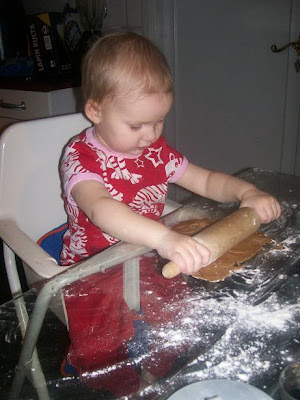 Haha, ja det är skoj det där med o baka pepparkakor...första gången var W 8,5 månader. Då tog vi bakbordet o la det på golvet, hade köpt bamseformar. Hon satt i degen, alla kakor vi tryckte ut drog hon huvudet av. Behöver jag skriva att inga var ätbar...men å så roligt hon hade.